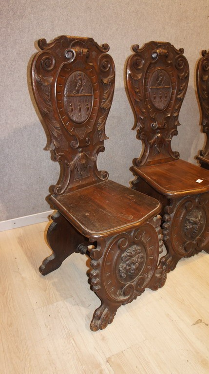 SEDIE (SCRANNI) RINASCIMENTO REALIZZATI IN NOCE SCOLPITO A RICREARE VOLUTE E DECORI PROPRIE DELLO STILE DI FINE '800. SI TRATTA DI MANIFATTURA ITALIANA. RIMASTE DISPONIBILI SOLO 4 PZ 50X44X116H