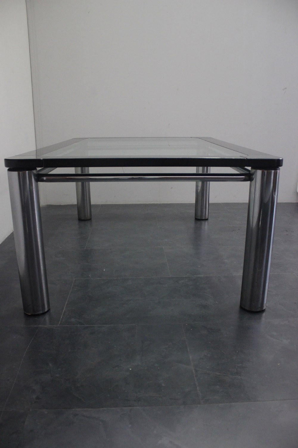 Tavolo da riunioni, databile anni '70 del XX secolo, gambe e struttura in acciaio, piano in cristallo con bordi in legno laccato nero.