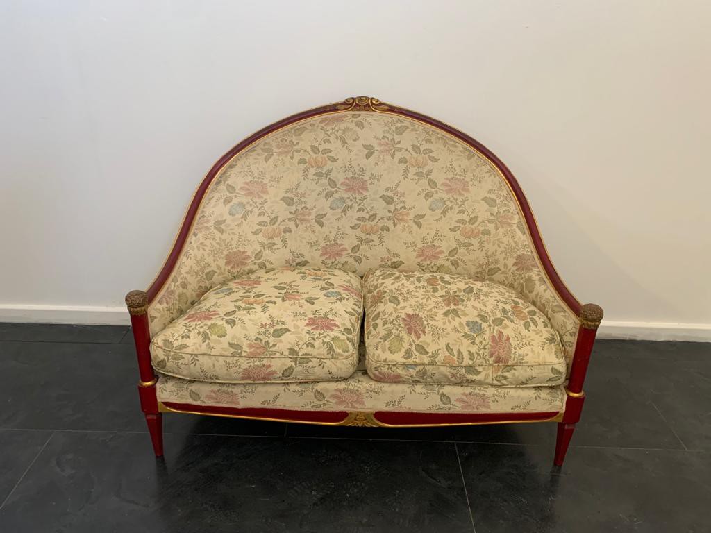 Prestigioso e singolare set da salotto con angolo te,Laccato rosso cardinale con pomoli finemente intagliati, apporti in foglia oro.